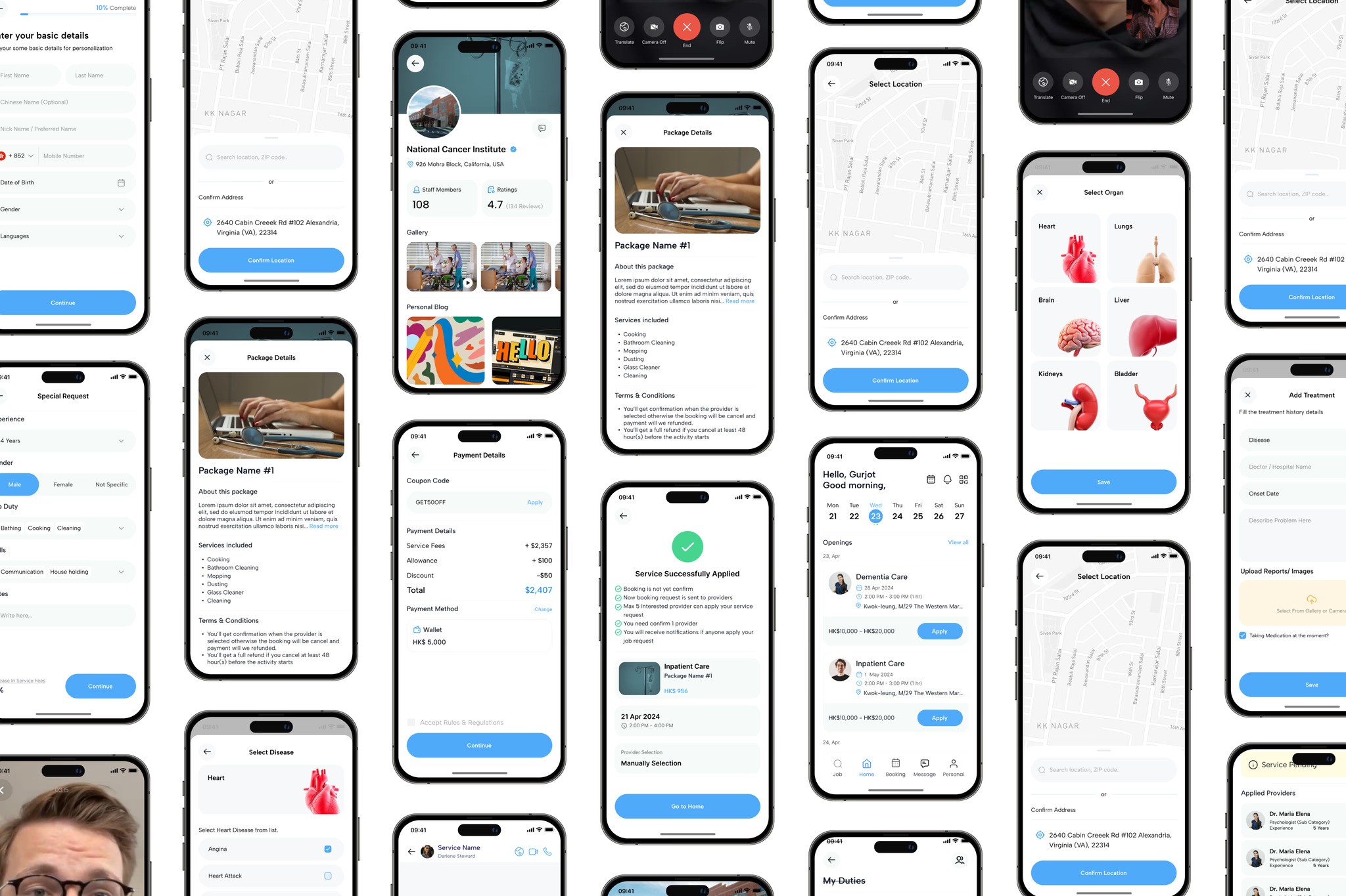 A key part of the design was ensuring that real medical workflows were digitized smoothly. I created an organ-based selector for disease input, a clean report-upload experience, and a treatment history section that organizes medical information in a clear, readable format. The location selection flow uses map integration, current-location detection, and address search to simplify both home-care and hospital visits. Payments were designed with complete transparency, showing coupon options, fee breakdowns, and all payment methods without overwhelming the user.
