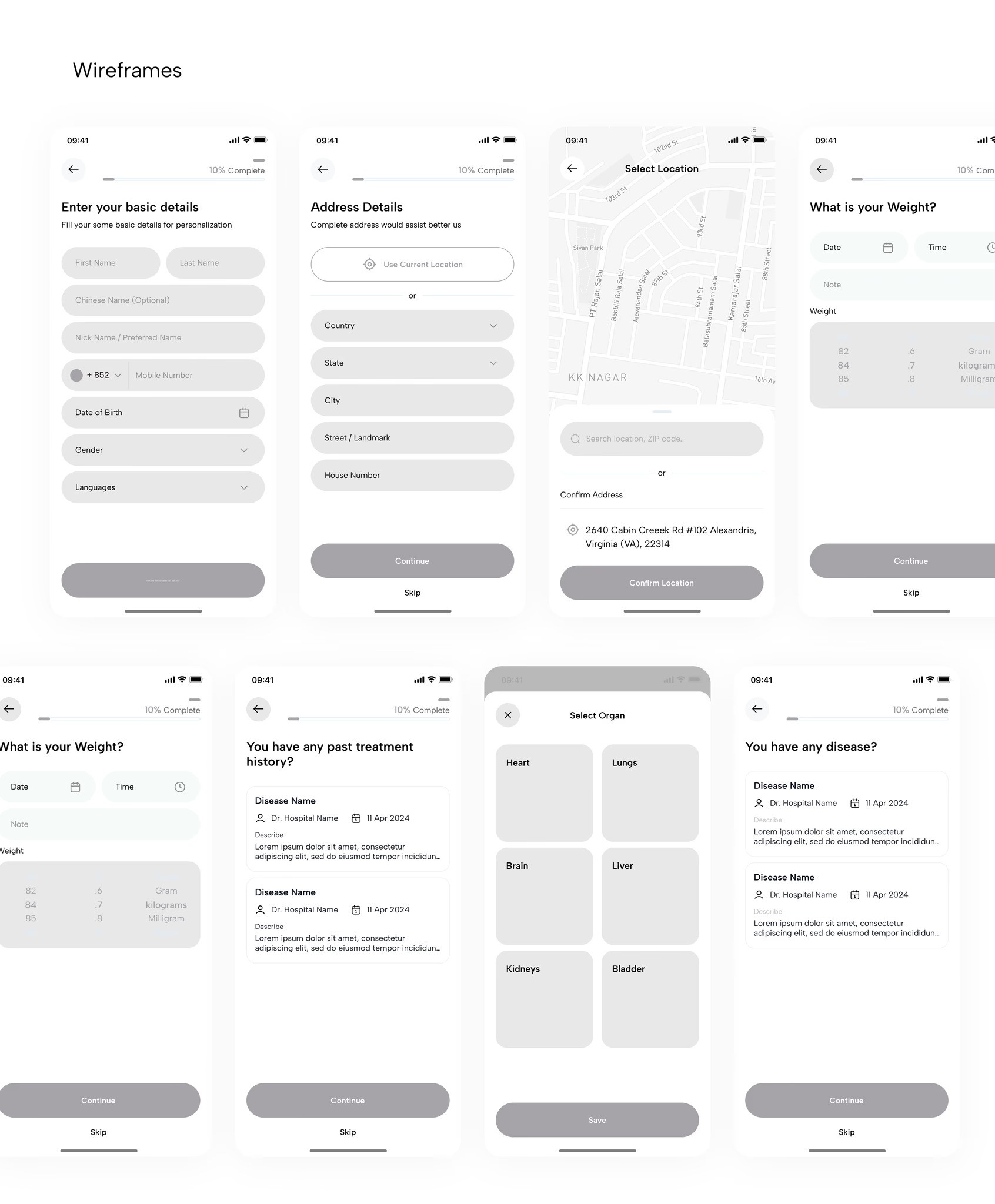 The design process began with mapping the user journeys for onboarding, provider selection, treatment updates, inpatient care booking, and payment flows. These journeys helped define a structure that minimized confusion and supported quick decision-making. The wireframes focused on readability, simplicity, and a guided progression model using step indicators to break complex medical tasks into smaller, manageable actions. Each screen was designed with familiar patterns and large touch targets to ensure easy navigation for all age groups, including elderly users.