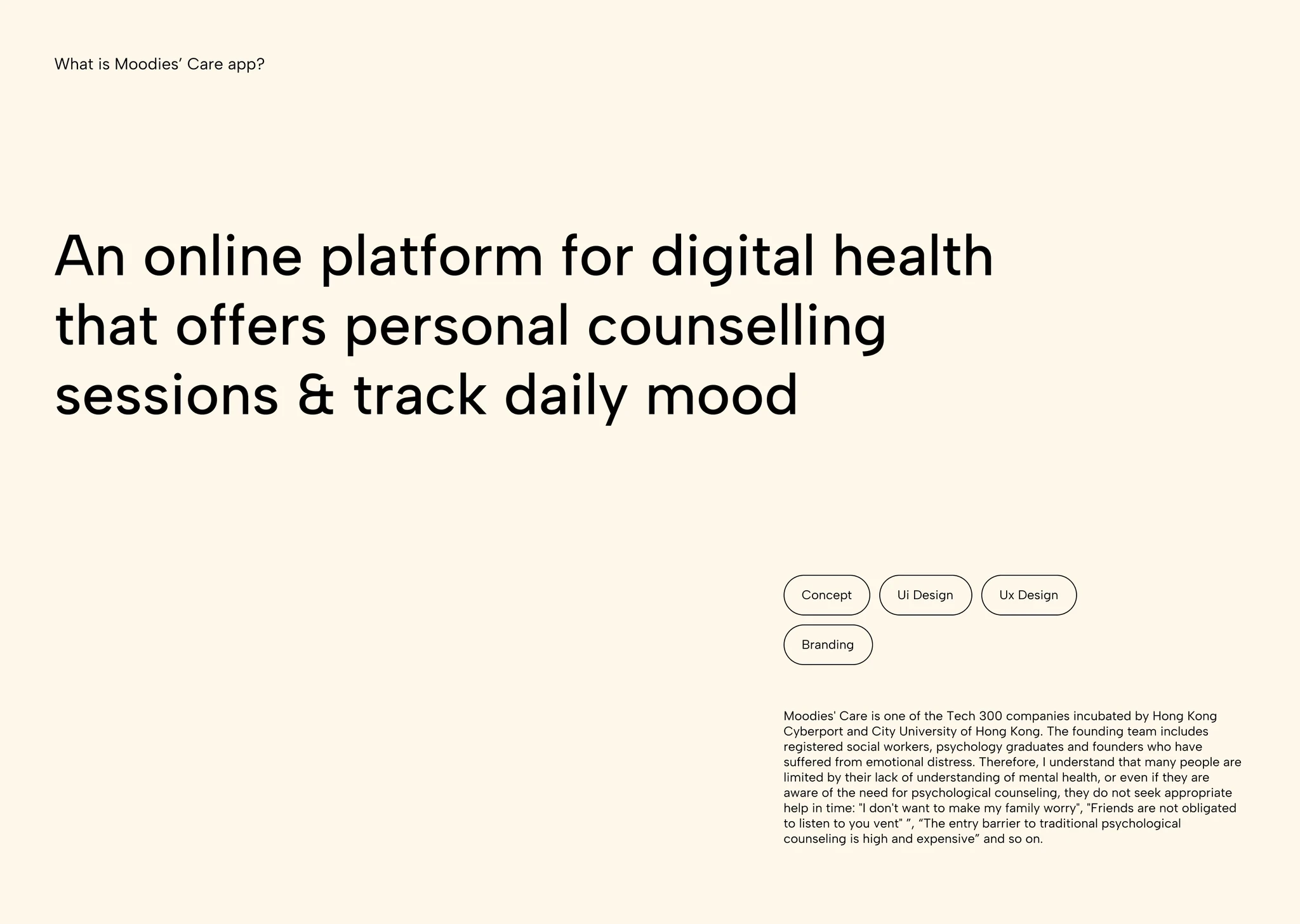 Moodies Care is a digital health platform designed to make psychological support more accessible, friendly, and approachable. The app offers personal counselling sessions, daily mood tracking, and self-help content tailored to emotional well-being.