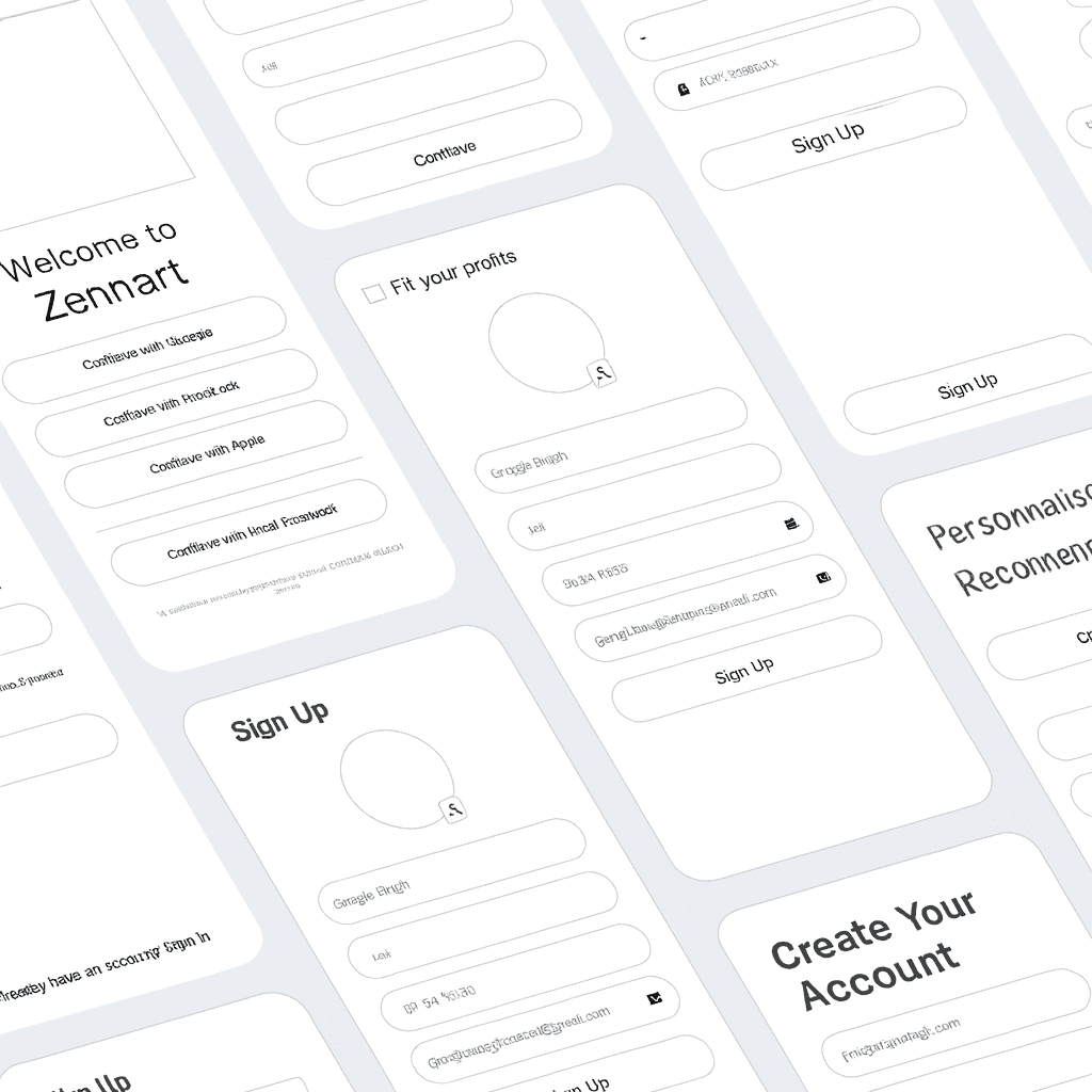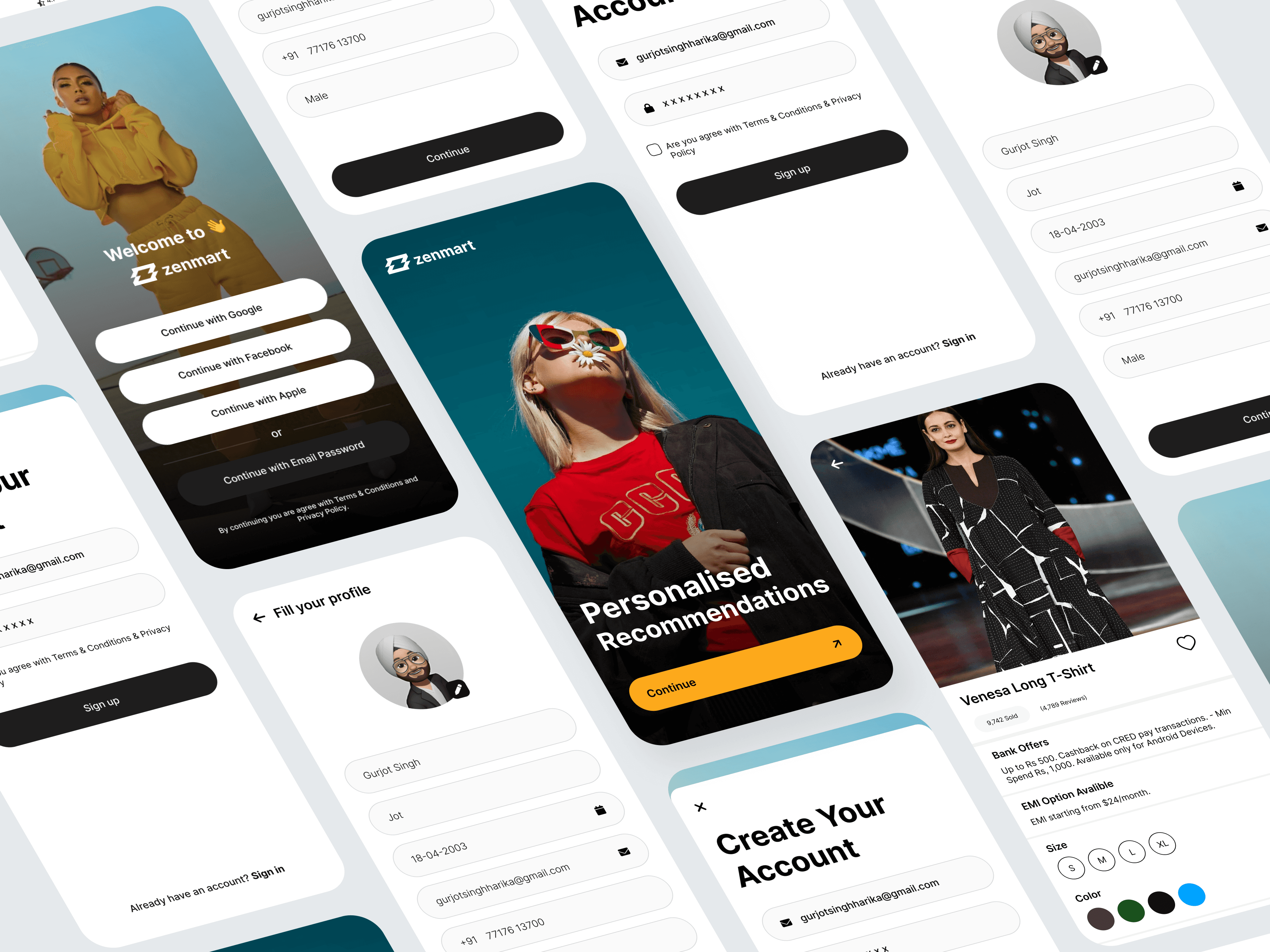 For Zenmart, my goal was to design a smooth, personalised onboarding experience that reduces friction and builds user trust from the very first interaction. The flow begins with visually engaging welcome screens that use strong lifestyle imagery to communicate Zenmart’s brand personality and fashion-forward positioning. I focused on creating a seamless sign-in experience by offering multiple social login options (Google, Facebook, Apple), ensuring quick entry while maintaining user convenience. Once inside, users are guided through a clean, minimal profile-setup process designed to feel effortless; each field is structured for quick scanning with ample spacing, large inputs, and supportive micro-interactions. The intention was to help the system deliver personalised recommendations without overwhelming new users.
