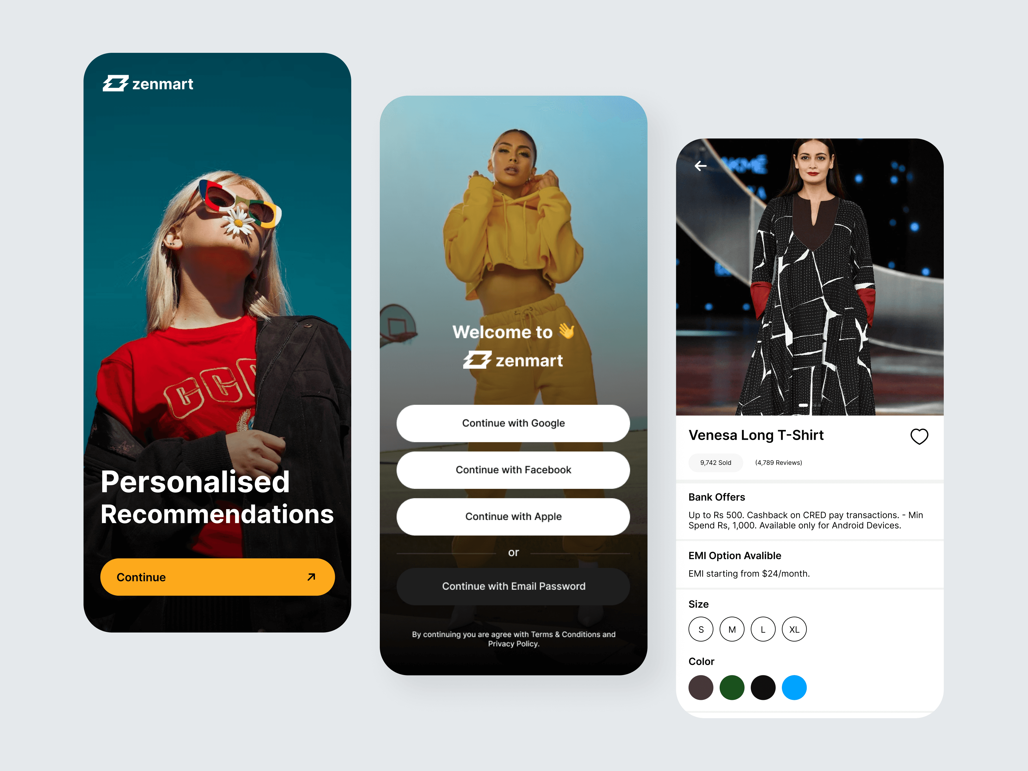 The shopping experience continues this simplicity. I designed product detail screens that balance visual hierarchy and clarity—placing the product image at the top, followed by essential information such as reviews, offers, EMI details, size options, and available colors. All interactive elements follow rounded, accessible patterns to create a friendly and modern feel. By keeping the interface airy and reducing cognitive load, users can easily focus on the product itself. Across the entire flow, my emphasis was on creating a familiar e-commerce experience while subtly elevating the brand through strong imagery, predictable patterns, and smooth transitions. Zenmart’s UX is intentionally minimal yet expressive, crafted to help users onboard quickly and shop confidently with a sense of personal relevance.